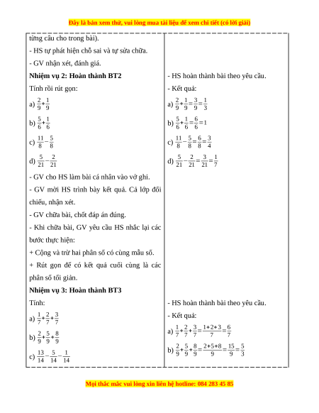 + Rút gọn để có kết quả cuối cùng là các phân số tối giản.