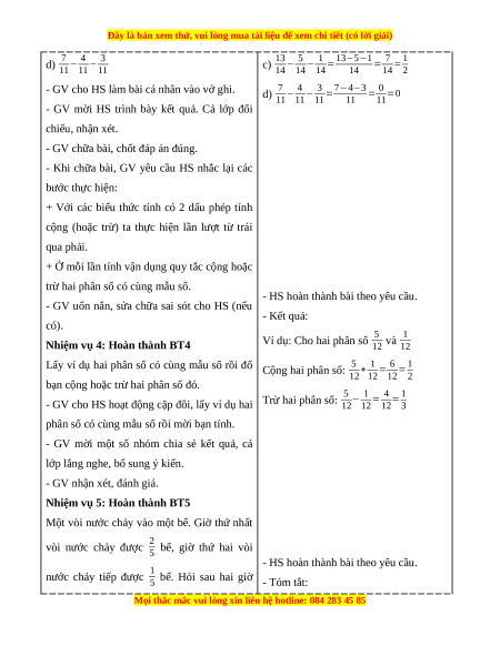 + Cộng và trừ hai phân số có cùng mẫu số.