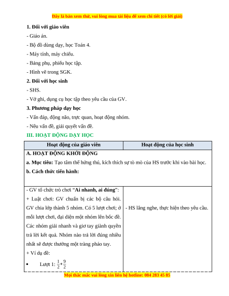 - Bộ đồ dùng dạy, học Toán 4. - Máy tính, máy chiếu.