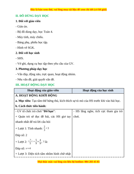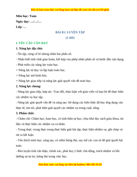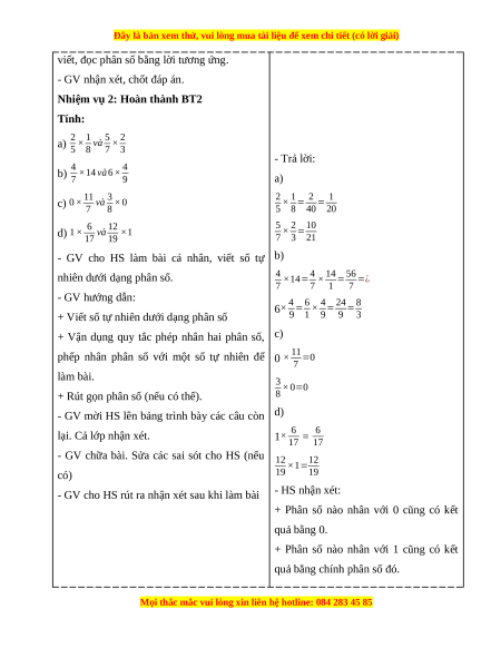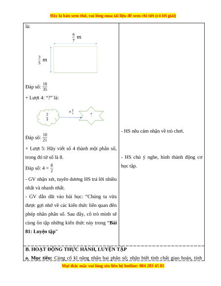 - Nhận biết tính chất giao hoán, kết hợp của phép nhân phân số và bước đầu vận dụng.