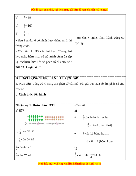 Nhiệm vụ 1: Hoàn thành BT1 - Trả lời: a) Số? a) 3của 14 hình thoi là: 7 3 ×14=6 (hình thoi) 7 1 b) của 18 là? 3 5 của 18 bông hoa là: 6 1 của 64 là? 8 5 ×18=15 (bông hoa) 6 2 của 42 là? 7 b) 4 1 của 27 là? của 18 là: 1 ×18=6 9 3 3