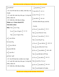 b) Ta có: của 28 là: × 28=4 1 7 7 a) của 20 km 4 1 Vậy của 28 g là 4 g. 1 7 b) của 28 g 7 3 3 c) Ta có: của 100 là: ×100=30 3 10 10 c) của 100 ml 10 3 Vậy của 100 ml là 30 ml. 3 10 d) của 640 tấn 4 3 3