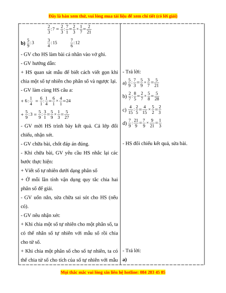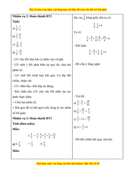 - Biết cách chia số tự nhiên cho phân số và phân số chia cho số tự nhiên.
