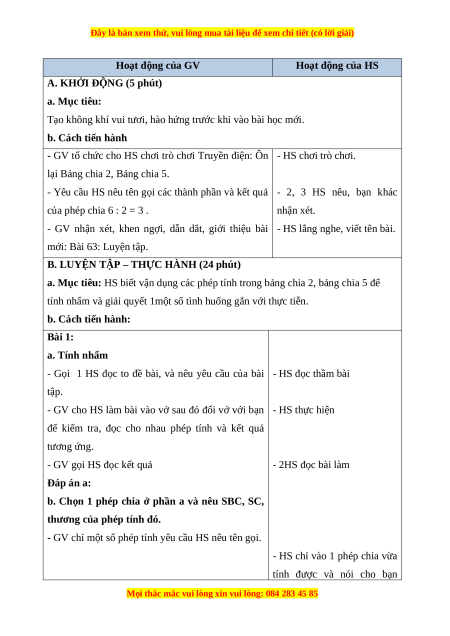 HS vận dụng phép chia đã học để trả lời được các câu hỏi trong bài toán thực tế b. Cách tiến hành: Bài 3: