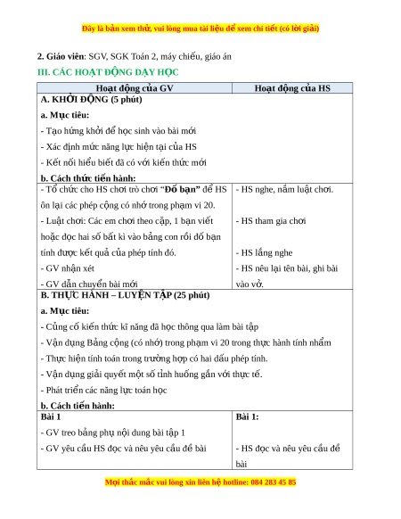 I. YÊU CẦU CẦN ĐẠT 1. Ki n t ế h c ứ H c ọ xong bài này, HS đ t ạ các yêu c u s ầ au: - V n ậ d ng B ụ ng c ả ng ( ộ có nh ) ớ trong ph m ạ vi 20 trong th c ự hành tính nh m ẩ - Th c hi ự n t ệ ính toán trong trư ng h ờ p ợ có hai d u phép t ấ ính. - V n ậ d ng gi ụ i ả quy t ế m t ộ s t ố nh hu ỉ ng g ố n ắ v i ớ th c t ự . ế - Phát tri n các ể năng l c ự toán h c ọ 2. Năng l c: ự - Năng l c ự chung: + Năng l c ự giao ti p, h ế p t ợ ác: + Năng l c ự gi i ả quy t ế v n đ ấ và s ề áng t o ạ - Năng l c