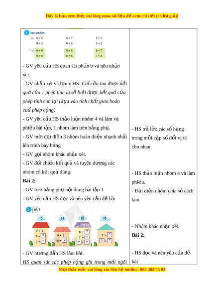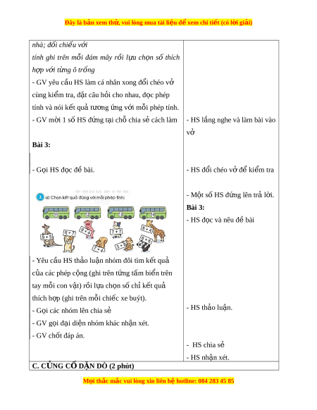 - GV yêu cầu HS làm cá nhân xong đ i ổ chéo v ở cùng ki m ể tra, đ t ặ câu h i ỏ cho nhau, đ c ọ phép tính và nói k t ế quả tư ng ơ ng v ứ i ớ m i ỗ phép tính. - GV m i ờ 1 số HS đ ng t ứ i ạ ch chi ỗ a sẻ cách làm - HS l ng nghe và ắ làm bài vào vở Bài 3: - G i ọ HS đ c đ ọ ề bài. - HS đ i ổ chéo v đ ở ki ể m ể tra - M t ộ số HS đ ng l ứ ên trả l i ờ . Bài 3: - HS đ c và nêu ọ đ bài ề - Yêu c u H ầ S th o l ả u n ậ nhóm đôi tìm k t ế qu ả c a ủ các phép c ng ộ (ghi trên t ng t ứ m ấ bi n t ể rên tay mỗi con v t ậ ) r i ồ l a ch ự n ọ s ch ố k ỉ t ế qu ả thích h p ợ (ghi trên m i ỗ chi c ế xe buýt). - G i ọ các nhóm lên chia sẻ - HS th o l ả u n. ậ - GV g i ọ đ i ạ di n nhóm ệ khác nh n ậ xét. - GV chốt đáp án. - HS chia sẻ - HS nh n xét ậ . C. C N Ủ G C D Ố ẶN DÒ (2 phút) M i