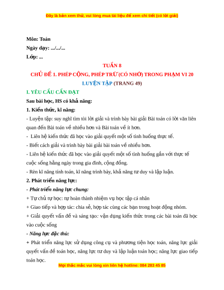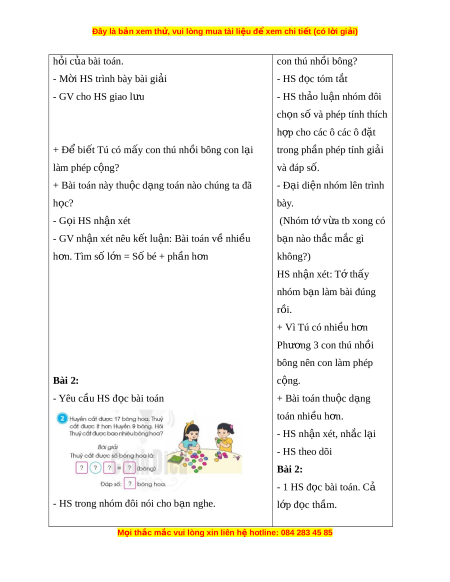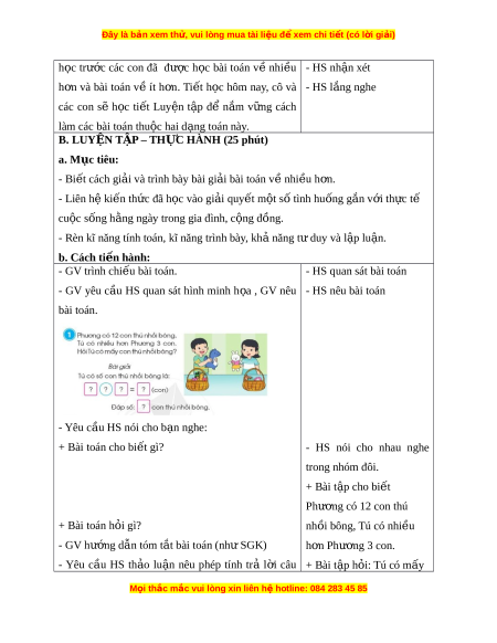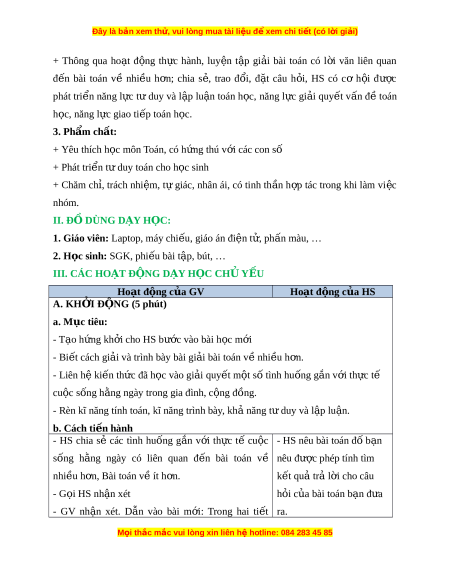 ử vui lòng mua tài li u ệ đ ể xem chi ti t ế (có l i ờ gi i ả ) + Thông qua ho t ạ đ ng ộ th c ự hành, luy n ệ t p ậ gi i ả bài toán có l i ờ văn liên quan đ n ế bài toán về nhi u ề h n; ơ chia s , ẻ trao đ i ổ , đ t ặ câu h i ỏ , HS có cơ h i ộ đư c ợ phát tri n ể năng l c ự tư duy và l p ậ lu n ậ toán h c, ọ năng l c ự gi i ả quy t ế v n ấ đ ề toán h c, ọ năng l c ự giao ti p t ế oán h c. ọ 3. Phẩm ch t ấ : + Yêu thích h c m ọ ôn Toán, có h ng ứ thú v i ớ các con số + Phát tri n t ể duy t ư oán cho h c s ọ inh + Chăm ch , ỉ trách nhi m ệ , t