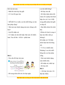 ọ số và phép tính thích h p ợ cho các ô các ô đ t ặ + Đ bi ể t ế Tú có m y con t ấ hú nh i ồ bông con l i ạ trong ph n phép t ầ ính gi i ả làm phép c ng ộ ? và đáp số. + Bài toán này thu c d ộ ng ạ toán nào chúng ta đã - Đ i ạ di n nhóm ệ lên trình h c? ọ bày. - G i ọ HS nh n ậ xét (Nhóm t v ớ a t ừ b xong có - GV nh n xét ậ nêu k t ế lu n: ậ Bài toán v nhi ề u ề b n ạ nào th c ắ m c gì ắ h n. ơ Tìm số l n = S ớ bé + ph ố n h ầ n ơ không?) HS nh n ậ xét: T t ớ h y ấ nhóm b n ạ làm bài đúng r i ồ . + Vì Tú có nhi u h ề n ơ Phư ng ơ 3 con thú nh i ồ bông nên con làm phép Bài 2: c ng. ộ - Yêu c u H ầ S đ c bài ọ toán + Bài toán thu c d ộ ng ạ toán nhi u h ề n. ơ - HS nh n xét ậ , nhắc l i ạ - HS theo dõi Bài 2: - 1 HS đ c bài ọ toán. C ả