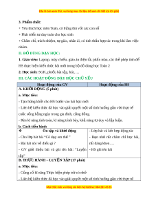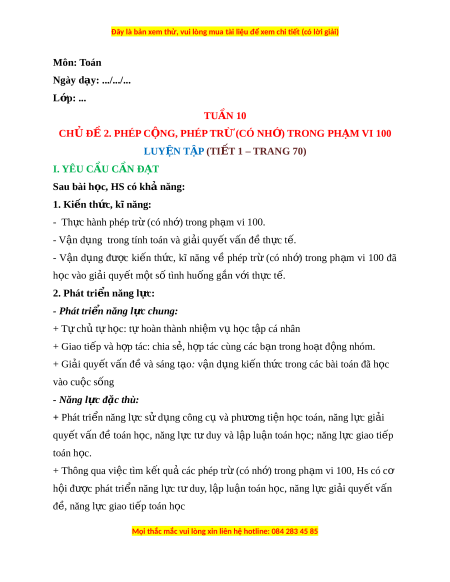 I. YÊU CẦU CẦN ĐẠT Sau bài h c, H ọ S có kh năng: ả 1. Ki n t ế h c, kĩ ứ năng: - Th c hành phép ự tr ( ừ có nh ) ớ trong ph m ạ vi 100. - V n ậ d ng t ụ rong tính toán và gi i ả quy t ế v n đ ấ t ề h c t ự . ế - V n ậ d ng ụ đư c ợ ki n ế th c, ứ kĩ năng v ề phép tr ừ (có nh ) ớ trong ph m ạ vi 100 đã h c ọ vào gi i ả quy t ế m t ộ số tình hu ng g ố n ắ v i ớ th c t ự . ế 2. Phát tri n nă ể ng lực: