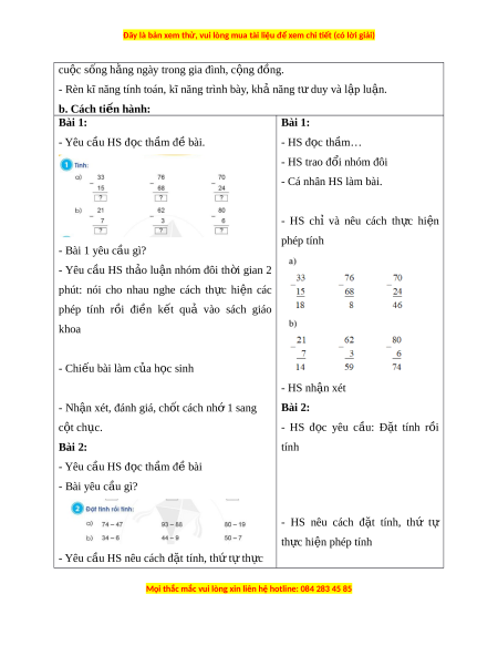 ứ rong các bài toán đã h c ọ vào cuộc sống - Năng l c ự đ c ặ thù: + Phát tri n ể năng l c ự sử d ng công c ụ ụ và phư ng t ơ iện h c t ọ oán, năng l c ự gi i ả quy t ế v n đ ấ t ề oán h c, ọ năng l c ự t duy và ư l p l ậ u n t ậ oán h c; ọ năng l c ự giao ti p ế toán h c. ọ + Thông qua vi c t ệ ìm k t ế qu các ả phép trừ (có nh ) ớ trong ph m ạ vi 100, Hs có c ơ h i