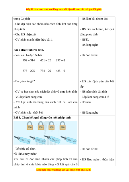 - Ôn tập thực hiện được phép cộng, phép trừ (không nhớ và có nhớ) trong phạm vi 1000.