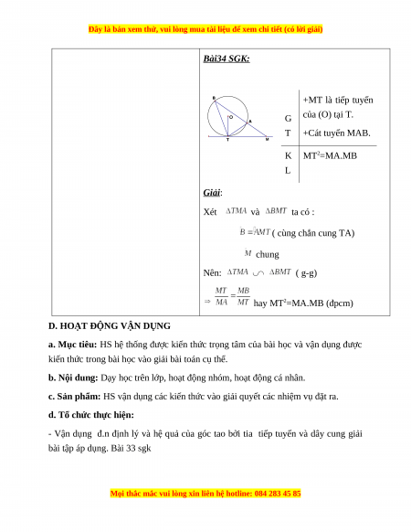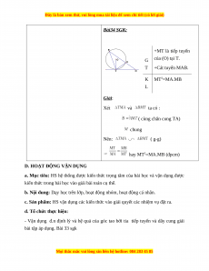 Bài34 SGK: B +MT là tiếp tuyến của (O) tại T. O G A T +Cát tuyến MAB. T M K MT2=MA.MB L Giải: Xét và ta có : ( cùng chắn cung TA) chung Nên: ( g-g) hay MT2=MA.MB (đpcm)