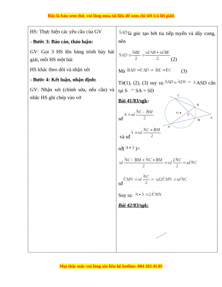 GV: Nhận xét (chỉnh sửa, nếu cần) và tại S SA = SD C nhắc HS ghi chép vào vở Bài 41/83/sgk: B O S A sđ M N và sđ sđ( )= sđ Suy ra: Bài 42/83/sgk: