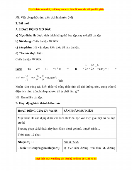 d) Tổ chức thực hiện: Chữa bài tập 78 SGK Giải: Ta có: C =2 R R = = (3đ) S = (3đ)