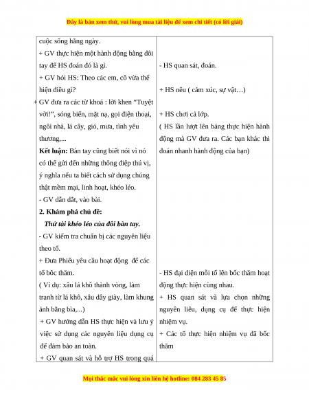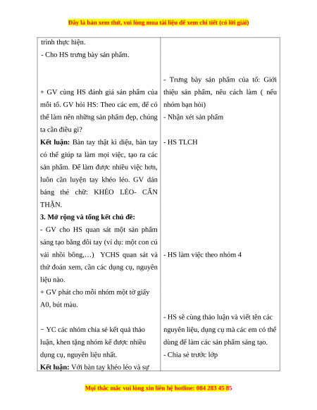 - HS tự đánh giá được sự khéo léo, cẩn thận của đôi bàn tay qua một hoạt động cụ