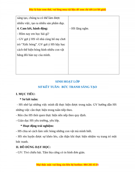 SƠ KẾT TUẦN: BỨC TRANH SÁNG TẠO I. MỤC TIÊU: * Sơ kết tuần: