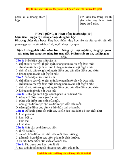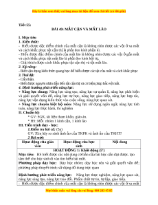 ắ lão là không nhìn đư c ợ các v t ậ ở g n ầ m t ắ và cách kh c ắ ph c t ụ t ậ m t ắ lão là ph i ả đeo kính h i ộ t . ụ - Gi i ả thích đư c ợ cách kh c ph ắ c t ụ t ậ c n t ậ h và t ị t ậ m t ắ lão. 2. K năng ỹ : - Bi t ế v n ậ d n ụ g ki n ế th c ứ quang h c ọ đ ể hi u ể đư c ợ các t t ậ c a ủ m t ắ và cách kh c ắ ph c ụ 3. Thái đ : ộ - C n ẩ th n ậ . - Bi t ế đư c ợ nguyên nhân d n ẫ đ n ế t t ậ c n ậ th ịvà có bi n ệ pháp b o ả v ệ m t ắ . 4. Đ nh h ị ư ng phát ớ tri n năng l ể c: ự + Năng l c ự chung: Năng l c ự sáng t o, ạ năng l c ự tự qu n ả lí, năng l c ự phát hi n ệ và gi i ả quy t ế v n ấ đ , ề năng l c ự tự h c, ọ năng l c ự giao ti p, ế năng l c ự h p ợ tác, năng l c ự v n d ậ ng ki ụ n t ế h c ứ vào cu c s ộ ng, ố năng l c quan s ự át. + Năng l c ự chuyên bi t