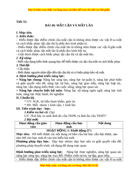 Đây là bản xem th , vu ử i lòng mua tài li u ệ đ xe ể m chi ti t (c ế ó l i ờ gi i ả ) Ti t ế 55: BÀI 49: M T Ắ CẬN VÀ M T Ắ LÃO I. M c t ụ iêu 1. Ki n ế th c: ứ - Hi u ể đư c ợ đ c ặ đi m ể chính c a ủ m t ắ c n ậ là không nhìn đư c ợ các v t ậ ở xa m t ắ và cách kh c ắ ph c t ụ t ậ c n ậ th l ị à ph i ả đeo kính ph n ậ kì. - Hi u ể đư c ợ đ c ặ đi m ể chính c a ủ m t
