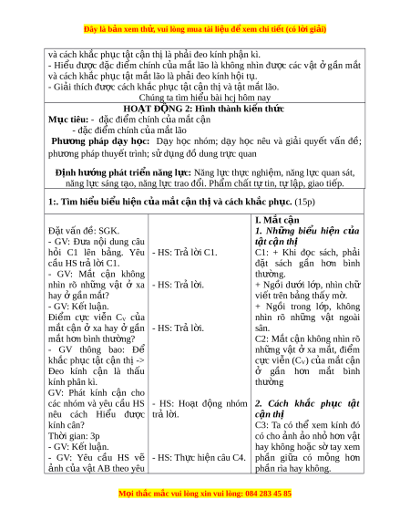 Ộ G 2: Hình thành ki n t ế h c ứ Mục tiêu: - đ c ặ đi m ể chính c a m ủ t ắ c n ậ - đ c ặ đi m ể chính c a m ủ t ắ lão Phư ng ơ pháp d y ạ h c: ọ D y ạ h c ọ nhóm; d y ạ h c ọ nêu và gi i ả quy t ế v n ấ đề; phư ng ơ pháp thuy t ế trình; s d ử ng đ ụ ồ dung tr c ự quan Đ nh h ị ư ng ớ phát tri n năng l ể c ự : Năng l c t ự h c nghi ự m ệ , năng l c quan s ự át, năng l c s ự áng t o, năng l ạ c ự trao đ i ổ . Ph m ẩ ch t ấ t t ự in, t l ự p, ậ giao ti p. ế 1:. Tìm hi u bi ể u hi ể n c ệ a m ủ t ắ c n t ậ h và cách kh ị c ắ ph c. ụ (15p) I. Mắt cận Đ t ặ v n đ ấ : ề SGK. 1. Nh ng ữ bi u ể hi n ệ c a ủ - GV: Đ a ư n i ộ dung câu tật cận th ị h i ỏ C1 lên b ng. ả Yêu - HS: Tr l ả i ờ C1. C1: + Khi đ c ọ sách, ph i ả cầu HS tr l ả i ờ C1. đ t ặ sách g n ầ h n ơ bình - GV: M t ắ c n ậ không thư ng. ờ nhìn rõ nh ng ữ v t ậ ở xa - HS: Tr l ả i ờ . + Ngồi dư i ớ l p, ớ nhìn chữ hay ở gần m t ắ ? vi t ế trên b ng ả th y m ấ . ờ - GV: K t ế lu n. ậ + Ng i ồ trong l p, ớ không Đi m ể c c ự vi n ễ CV c a ủ nhìn rõ nh ng ữ v t ậ ngoài m t ắ c n ậ ở xa hay ở g n ầ - HS: Tr l ả i ờ . sân. m t ắ h n bì ơ nh thư ng? ờ C2: M t ắ c n ậ không nhìn rõ - GV thông bao: Để nh ng ữ v t ậ ở xa m t ắ , đi m ể kh c ắ ph c ụ t t ậ c n ậ thị -> c c ự vi n ễ (CV) c a ủ m t ắ c n ậ Đeo kính c n ậ là th u ấ ở gần h n ơ m t ắ bình kính phân kì. thư ng ờ GV: Phát kính c n ậ cho các nhóm và yêu c u ầ HS - HS: Ho t ạ đ ng