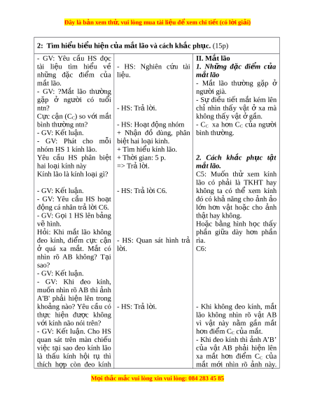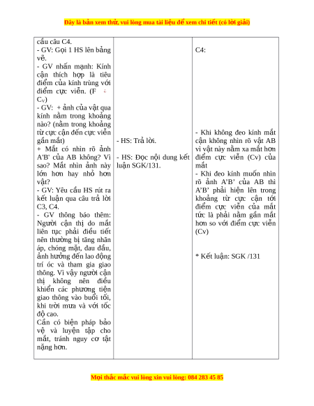 Đây là bản xem th , vu ử i lòng mua tài li u ệ đ xe ể m chi ti t (c ế ó l i ờ gi i ả ) cầu câu C4. - GV: G i ọ 1 HS lên b ng ả C4: vẽ. - GV nh n ấ m nh: ạ Kính c n ậ thích h p ợ là tiêu đi m ể c a ủ kính trùng v i ớ đi m ể c c ự vi n. ễ (F ¿ CV) - GV: + nh ả c a ủ v t ậ qua kính n m ằ trong kho ng ả nào? (n m ằ trong kho ng ả t c ừ c ự c n ậ đ n c ế c vi ự n ễ - Khi không đeo kính m t ắ gần m t ắ ) - HS: Tr l ả i ờ . c n ậ không nhìn rõ v t ậ AB + M t ắ có nhìn rõ nh ả vì v t ậ này n m ằ xa m t ắ h n ơ A'B' c a ủ AB không? Vì - HS: Đ c ọ n i ộ dung k t ế đi m ể c c ự vi n ễ (Cv) c a ủ sao? M t ắ nhìn nh ả này lu n ậ SGK/131. m t ắ l n ớ h n ơ hay nhỏ h n ơ - Khi đeo kính mu n ố nhìn v t ậ ? rõ nh ả A’B’ c a ủ AB thì - GV: Yêu c u ầ HS rút ra A’B’ ph i ả hi n ệ lên trong k t ế lu n ậ qua câu trả l i ờ kho ng ả từ c c ự c n ậ t i ớ C3, C4. đi m ể c c ự vi n ễ c a ủ m t ắ - GV thông báo thêm: t c ứ là ph i ả n m ằ g n ầ m t ắ Ngư i ờ c n ậ thị do m t ắ h n ơ so v i ớ đi m ể c c ự vi n ễ liên t c ụ ph i ả đi u ề ti t ế (Cv) nên thư ng ờ bị tăng nhãn áp, chóng m t ặ , đau đ u, ầ nh ả hư ng đ ở n l ế ao đ ng ộ * K t ế lu n: ậ SGK /131 trí óc và tham gia giao thông. Vì v y ậ ngư i ờ c n ậ thị không nên đi u ề khi n ể các phư ng ơ ti n ệ giao thông vào bu i ổ t i ố , khi tr i ờ m a ư và v i ớ t c ố độ cao. Cần có bi n ệ pháp b o ả vệ và luy n ệ t p ậ cho m t ắ , tránh nguy cơ t t ậ n ng ặ h n. ơ M i ọ thắc m c