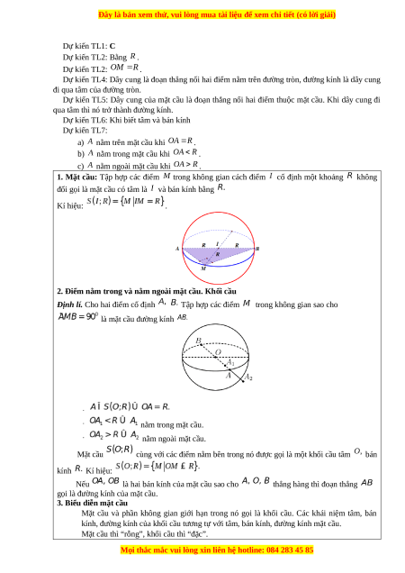 Nội dung 1: Mặt cầu và các khái niệm liên quan đến mặt cầu