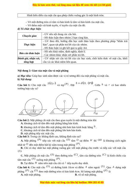+ Năng lực tư duy và lập luận toán học: Giải thích được sự tương giao của mặt cầu và mặt phẳng,