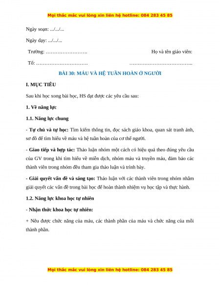 BÀI 30: MÁU VÀ HỆ TUẦN HOÀN Ở NGƯỜI I. MỤC TIÊU