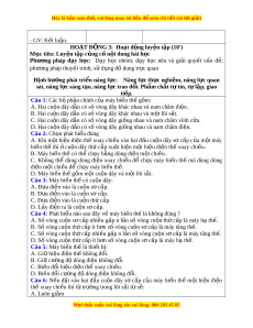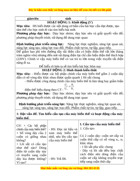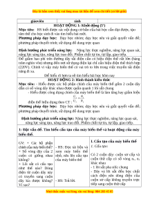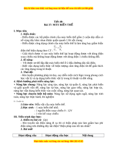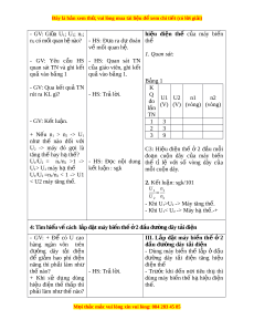 dẫn có số vòng dây khác nhau đư c ợ qu n quanh ấ 1 lõi s t ắ chung - Hi u ể đư c ợ công d ng ụ chính c a ủ máy bi n ế th ế là làm tăng hay gi m ả hi u ệ U N 1 1 điện th hi ế u d ệ ng t ụ heo CT : U N 2 2 Phư ng ơ pháp d y ạ h c: ọ D y ạ h c ọ nhóm; d y ạ h c ọ nêu và gi i ả quy t ế v n ấ đề; phư ng ơ pháp thuy t ế trình; s d ử ng đ ụ ồ dung tr c ự quan Đ nh h ị ư ng ớ phát tri n năng l ể c ự : Năng l c t ự h c nghi ự m ệ , năng l c quan s ự át, năng l c s ự áng t o, năng l ạ c ự trao đ i ổ . Ph m ẩ ch t ấ t t ự in, t l ự p, ậ giao ti p. ế 1: Đ t ặ v n ấ đ . ề Tìm hi u ể c u ấ t o ạ c a ủ máy bi n ế th ế và ho t ạ đ ng ộ c a ủ máy bi n t ế h . ế GV: + Các bộ ph n ậ I. Cấu tạo c a m ủ áy bi n t ế hế chính c a ủ máy bi n ế th ? ế - HS: Đ c ọ tài li u ệ và 1. Cấu t o ạ : + Số vòng dây c a ủ 2 xem máy bi n ế thế cu n ộ có gi ng ố nhau nh , ỏ nêu lên c u ấ t o ạ Có 2 cu n ộ dây: cu n ộ sơ c p ấ và không? c a ủ máy bi n t ế hế cu n ộ thứ c p ấ có số vòng n1, n2 + Lõi s t ắ có c u ấ t o ạ khác nhau như thế nào? Dòng - 1 lõi s t ắ pha silíc chung điện từ cu n ộ dây này - Dây và lõi s t ắ đ u ề b c ọ ch t ấ có truy n ề sang cu n ộ cách đi n ệ nên dòng đi n ệ c a ủ dây kia đư c ợ không? - HS: Tr l ả i ờ . cu n ộ sơ c p ấ không truy n ề tr c ự Vì sao? ti p s ế ang cu n ộ th c ứ p ấ M i ọ thắc m c