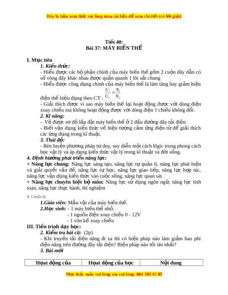 Đây là bản xem th , vu ử i lòng mua tài li u ệ đ xe ể m chi ti t (c ế ó l i ờ gi i ả ) Ti t ế 40: Bài 37: MÁY BI N Ế THẾ I. M c t ụ iêu 1. Ki n ế th c: ứ - Hi u ể đư c ợ các bộ ph n ậ chính c a ủ máy bi n ế th ế g m ồ 2 cu n ộ dây d n ẫ có