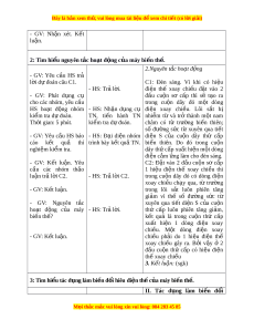 C1: Đèn sáng. Vì khi có hi u ệ - HS: Tr l ả i ờ . điện thế xoay chi u ề đ t ặ vào 2 - GV: Phát d ng ụ cụ đầu cu n ộ sơ c p ấ thì sẽ t o ạ ra cho các nhóm, yêu c u ầ trong cu n ộ dây đó m t ộ dòng HS ho t ạ đ ng ộ nhóm - HS: Nh n ậ d ng ụ cụ điện xoay chi u. ề Lõi s t ắ bị ki m ể tra d đoán. ự TN, ti n ế hành TN nhi m ễ từ và trở thành m t ộ nam Th i ờ gian: 5 phút. ki m ể tra d đoán. ự châm có từ trư ng ờ bi n ế thiên; số đư ng ờ s c ứ từ xuyên qua ti t ế - GV: Yêu c u ầ HS báo - HS: Đ i ạ di n ệ nhóm diện S c a ủ cu n ộ dây thứ c p ấ cáo k t ế quả thí trình bày k t ế qu ả TN. bi n ế thiên. Do đó trong cu n ộ nghiệm ki m ể tra. dây thứ c p ấ xu t ấ hi n ệ m t ộ dòng điện c m ả ng l ứ àm cho đèn sáng. - GV: K t ế lu n. ậ Yêu C2: Đ t ặ vào 2 đ u ầ cu n ộ sơ c p ấ cầu các nhóm th o ả 1 hi u ệ đi n ệ thế xoay chi u ề thì lu n ậ trả l i ờ C2. - HS: Tr l ả i ờ C2. trong cu n ộ dây đó có dòng đi n ệ xoay chi u ề ch y ạ qua, từ trư ng ờ - GV: K t ế lu n. ậ trong lõi s t ắ luôn phiên tăng gi m ả vì thế số đư ng ờ s c ứ từ - GV: Nguyên t c ắ xuyên qua ti t ế di n ệ S c a ủ cu n ộ ho t ạ đ ng ộ c a ủ máy - HS: Tr l ả i ờ . thứ c p ấ luôn phiên tăng gi m ả , bi n t ế h ? ế k t ế quả là trong cu n ộ thứ c p ấ xu t ấ hi n ệ 1 dòng đi n ệ xoay chi u. ề M t ộ dòng đi n ệ xoay - GV: K t ế lu n. ậ chi u ề ph i ả do 1 hi u ệ đi n ệ thế xoay chi u ề gây ra. B i ở v y ậ ở 2 đầu cu n ộ thứ c p ấ có hi u ệ đi n ệ th xoay chi ế u ề 3. K t ế lu n: ậ (sgk) 3: Tìm hi u ể tác d n ụ g làm bi n ế đ i ổ hiêu đi n ệ th ế c a ủ máy bi n ế th . ế II. Tác d ng ụ làm bi n ế đ i ổ M i ọ thắc m c