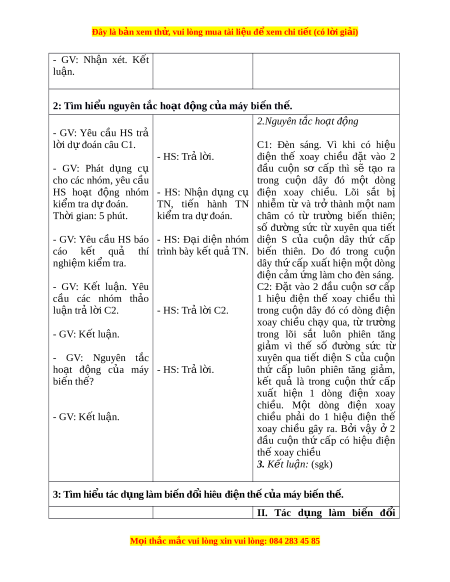 Đây là bản xem th , vu ử i lòng mua tài li u ệ đ xe ể m chi ti t (c ế ó l i ờ gi i ả ) - GV: Nh n ậ xét. K t ế lu n. ậ 2: Tìm hi u nguyên t ể c ho ắ t ạ đ ng c ộ a m ủ áy bi n t ế h . ế 2.Nguyên t c ho ắ t ạ đ ng ộ - GV: Yêu c u ầ HS trả l i ờ dự đoán câu C1.