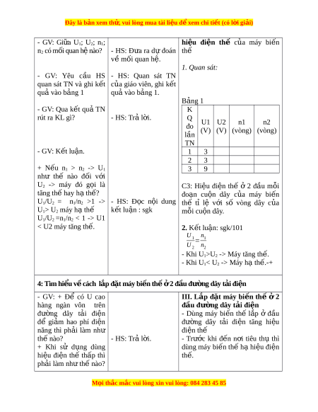 Đây là bản xem th , vu ử i lòng mua tài li u ệ đ xe ể m chi ti t (c ế ó l i ờ gi i ả ) - GV: Gi a ữ U1; U2; n1; hi u ệ đi n ệ thế c a ủ máy bi n ế n2 có m i ố quan h ệ nào? - HS: Đ a ư ra dự đoán thế v m ề ối quan h . ệ 1. Quan sát: - GV: Yêu c u ầ HS - HS: Quan sát TN quan sát TN và ghi k t ế c a ủ giáo viên, ghi k t ế quả vào b ng 1 ả quả vào b ng 1. ả B ng ả 1 - GV: Qua k t ế quả TN K rút ra KL gì? - HS: Tr l ả i ờ . Q U1 U2 n1 n2 đo (V) (V) (vòng) (vòng) lần TN - GV: K t ế lu n. ậ 1 3 2 3 + N u ế n1 > n2 -> U1 3 9 như thế nào đ i ố v i ớ U2 -> máy đó g i ọ là C3: Hi u ệ đi n ệ thế ở 2 đ u ầ m i ỗ tăng th hay ế h t ạ h ? ế đo n ạ cu n ộ dây c a ủ máy bi n ế