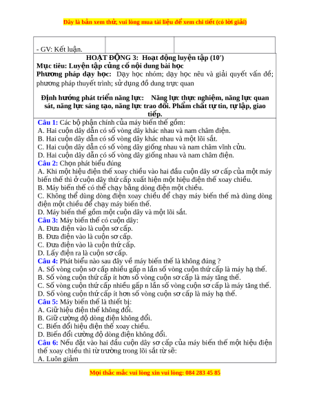 ự Năng l c ự th c ự nghi m ệ , năng l c ự quan sát, năng l c ự sáng t o, ạ năng l c t ự rao đ i ổ . Ph m ẩ ch t ấ t t ự in, t l ự p, gi ậ ao ti p. ế Để gi m ả hao phí trên đư ng ờ dây t i ả đi n ệ c n ầ có hi u ệ đi n ệ thế r t ấ l n ớ (hàng trăm nghìn vôn) nh ng ư đ n n ế i ơ s d ử ng ụ đi n ệ l i ạ ch c ỉ n ầ hi u ệ đi n t ệ h ế thích h p ợ (220V). Chính vì v y ậ máy bi n ế thế có vai trò to l n ớ trong vi c ệ truy n ề t i ả đi n ệ năng đi xa. Đ hi ể u r ể õ h n t ơ a sẽ tìm hi u bài ể h c ọ hôm nay HOẠT Đ N