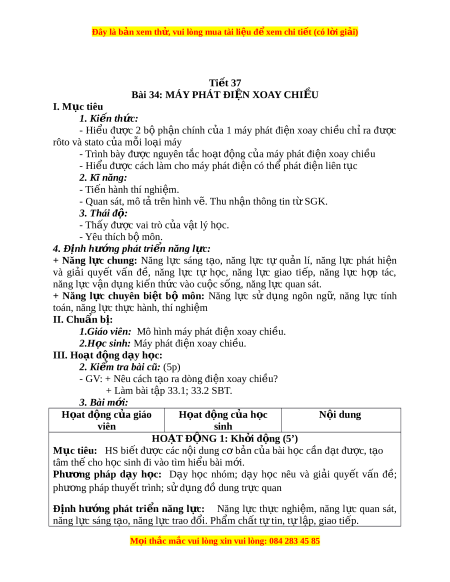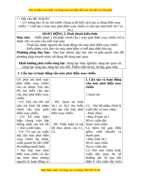 Đây là bản xem th , vu ử i lòng mua tài li u ệ đ xe ể m chi ti t (c ế ó l i ờ gi i ả ) => Đ t ặ v n đ ấ : ề SGK/93 - GV thông báo: các bài ở trư c chúng ớ ta đã bi t ế cách t o ạ ra dòng đi n xoay ệ chi u - ề > Ch t ế o ạ 2 lo i ạ máy phát đi n xoay chi ệ u có c ề u t ấ o ạ nh hì ư nh 34.1 và 34.2. HOẠT Đ N