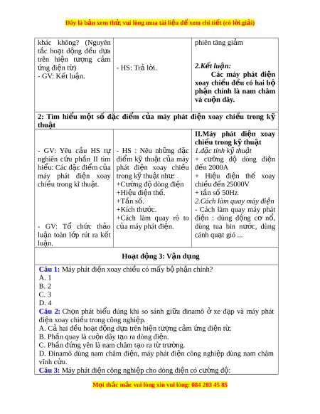 Đây là bản xem th , vu ử i lòng mua tài li u ệ đ xe ể m chi ti t (c ế ó l i ờ gi i ả ) khác không? (Nguyên phiên tăng gi m ả t c ắ ho t ạ đ ng ộ đ u ề d a ự trên hi n ệ tư ng ợ c m ả ng đi ứ ện t ) ừ - HS: Tr l ả i ờ . 2.K t ế luận: - GV: K t ế lu n. ậ Các máy phát đi n ệ xoay chi u ề đ u ề có hai bộ phận chính là nam châm và cu n dây ộ . 2: Tìm hi u ể m t ộ số đ c ặ đi m ể c a ủ máy phát đi n ệ xoay chi u ề trong kỹ thuật II.Máy phát đi n ệ xoay chi u t ề rong k t ỹ hu t ậ - GV: Yêu c u ầ HS tự - HS : Nêu nh ng ữ đ c ặ 1.đ c t ặ ính kỹ thu t ậ nghiên c u ứ ph n ầ II tìm đi m ể kỹ thu t ậ c a ủ máy + cư ng ờ độ dòng đi n ệ hi u: ể Các đ c ặ đi m ể c a ủ phát đi n ệ xoay chi u ề đ n 2000A ế máy phát đi n ệ xoay trong k t ỹ hu t ậ nh : ư + Hi u ệ đi n ệ thế xoay chi u ề trong kĩ thu t ậ . +Cư ng ờ đ dòng đi ộ n ệ chi u ề đ n ế 25000V +Hi u đ ệ i n t ệ h . ế + tần số 50Hz +Tần số.