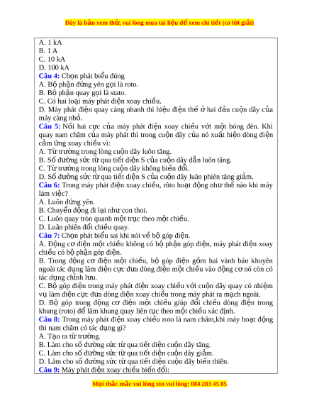 Đây là bản xem th , vu ử i lòng mua tài li u ệ đ xe ể m chi ti t (c ế ó l i ờ gi i ả ) A. 1 kA B. 1 A C. 10 kA D. 100 kA Câu 4: Ch n phát ọ bi u ể đúng A. B ph ộ n ậ đ ng yên g ứ i ọ là roto. B. B ph ộ n ậ quay g i ọ là stato. C. Có hai lo i ạ máy phát đi n xoay ệ chi u. ề D. Máy phát đi n ệ quay càng nhanh thì hi u ệ đi n ệ th ế ở hai đ u ầ cu n ộ dây c a ủ máy càng nh . ỏ Câu 5: N i ố hai c c ự c a ủ máy phát đi n ệ xoay chi u ề v i ớ m t ộ bóng đèn. Khi quay nam châm c a ủ máy phát thì trong cu n ộ dây c a ủ nó xu t ấ hi n ệ dòng đi n ệ c m ả ng xoay chi ứ u vì ề : A. T t ừ rư ng t ờ rong lòng cu n dây l ộ uôn tăng. B. Số đư ng ờ s c t ứ ừ qua ti t ế di n S c ệ a ủ cu n dây d ộ n l ẫ uôn tăng. C. T t ừ rư ng ờ trong lòng cu n ộ dây không bi n đ ế i ổ . D. Số đư ng s ờ ức t qua t ừ i t ế di n S c ệ a cu ủ n