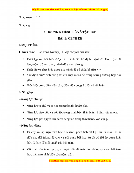 CHƯƠNG I: MỆNH ĐỀ VÀ TẬP HỢP BÀI 1: MỆNH ĐỀ I. MỤC TIÊU:
