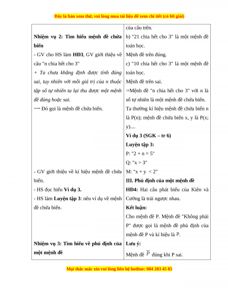 đề toán học, mệnh đề chứa biến, phủ định của mệnh đề và xét tính đúng sai của mệnh đề.