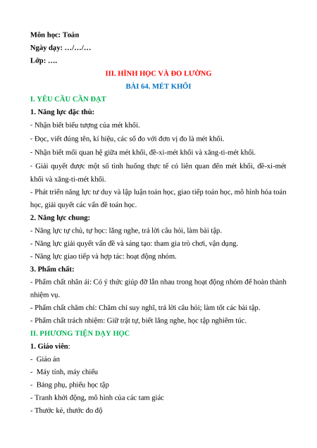 Giáo án Mét khối Toán lớp 5 Cánh diều