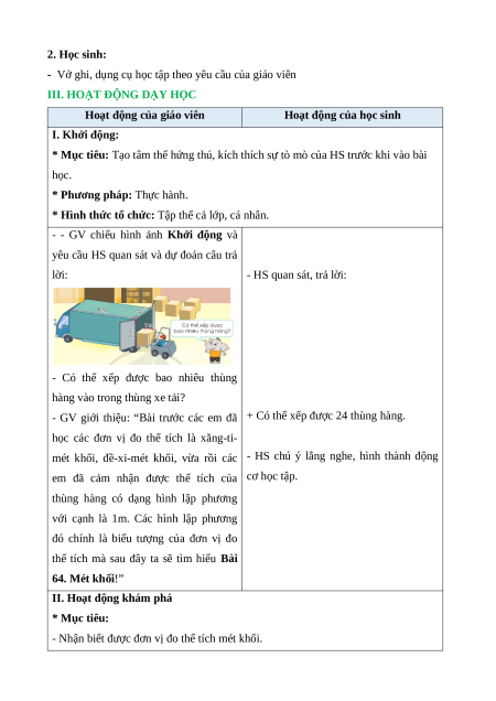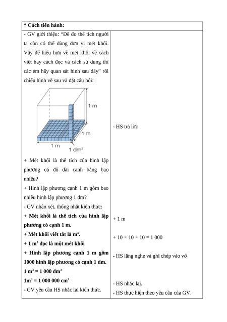 - Nhận biết được đơn vị đo thể tích mét khối. * Cách tiến hành: