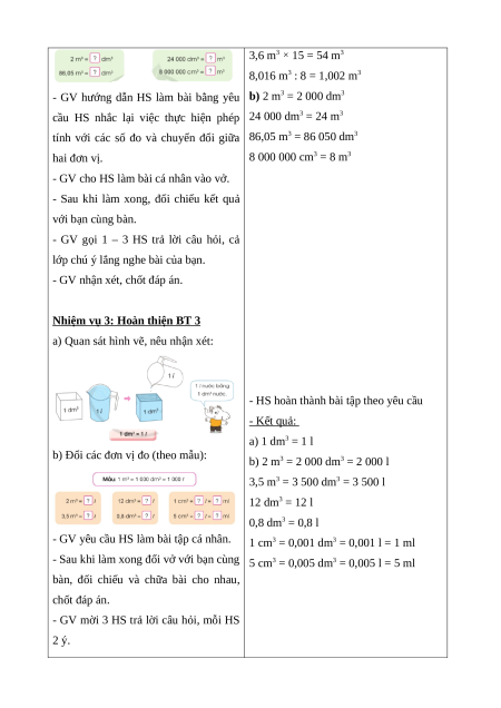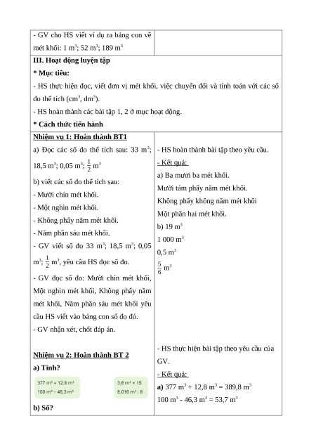 - HS thực hiện đọc, viết đơn vị mét khối, việc chuyển đổi và tính toán với các số đo thể tích (cm3, dm3).