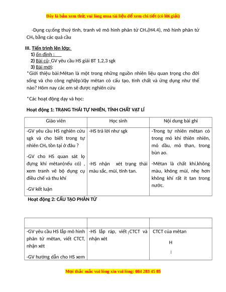 -Dụng cụ:ống thuỷ tinh, tranh vẽ mô hình phân tử CH4(H4.4), mô hình phân tử CH4 bằng các quả cầu III. T