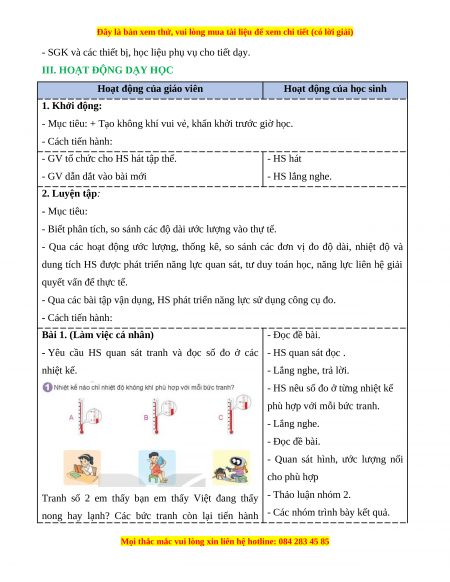 - Qua các hoạt động ước lượng, thống kê, so sánh các đơn vị đo độ dài, nhiệt độ và