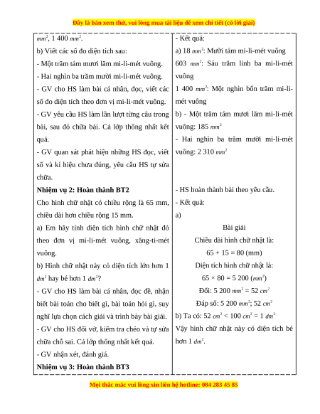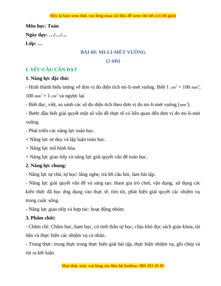- Bước đầu biết giải quyết một số vấn đề thực tế có liên quan đến đơn vị đo mi-li-mét vuông.