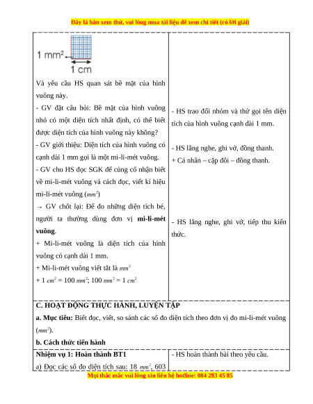 a. Mục tiêu: Biết đọc, viết, so sánh các số đo diện tích theo đơn vị đo mi-li-mét vuông (mm2).