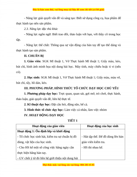 2. Học sinh: SGK Mĩ thuật 1, Vở Thực hành Mĩ thuật 1; Giấy màu, màu vẽ,