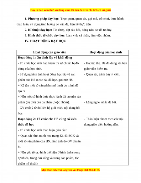 2. Học sinh: SGK Mĩ thuật 1, Vở Thực hành Mĩ thuật 1; giấy/ bìa màu, màu