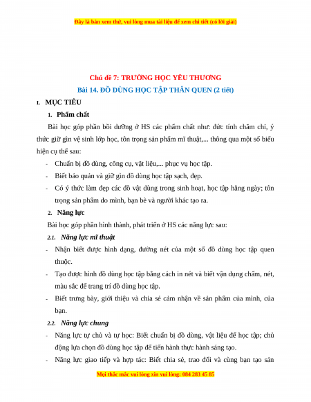 Bài 14. ĐỒ DÙNG HỌC TẬP THÂN QUEN (2 tiết) I. MỤC TIÊU 1. Phẩm chất