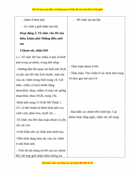 và yêu cầu HS nêu kích thước, màu sắc – Thảo luận: Tìm chấm ở các hình ảnh trang