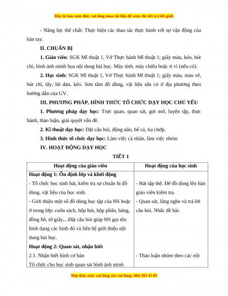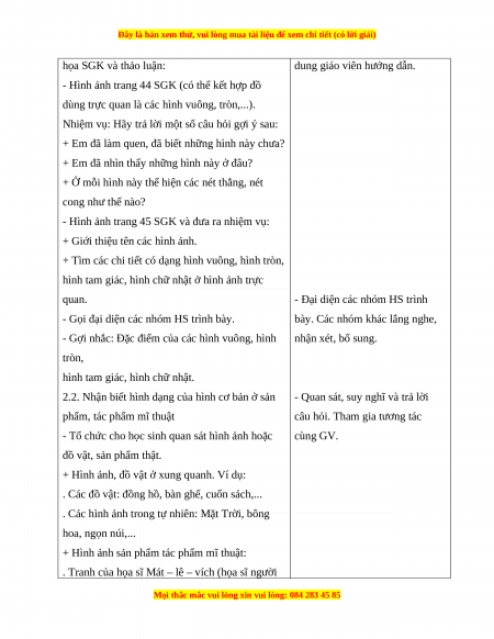 2. Học sinh: SGK Mĩ thuật 1, Vở Thực hành Mĩ thuật 1; giấy màu, màu vẽ,